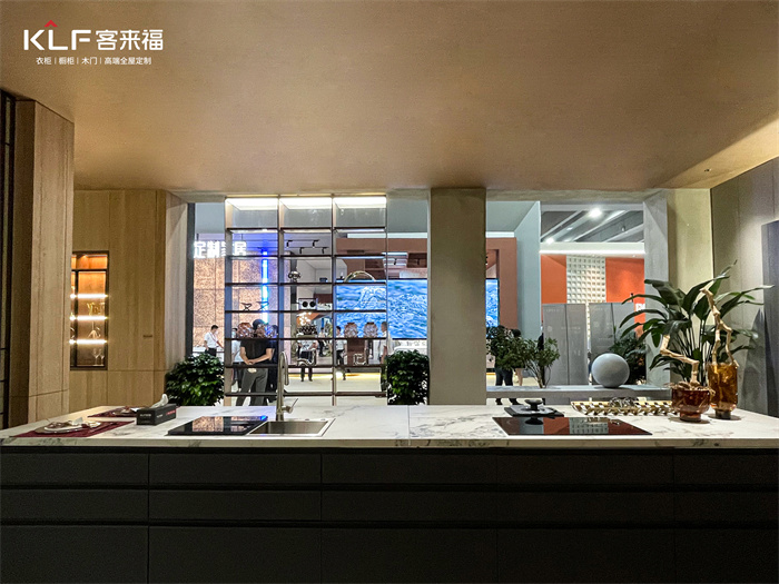 時(shí)尚、年輕、“放空”的空間,讓生活充滿情調(diào)。憑借著金屬的時(shí)尚+低飽和度莫蘭迪門板元素,將整體的空間打造出婉約直達(dá)內(nèi)心的意境,為參展觀眾展現(xiàn)了客來福強(qiáng)大的產(chǎn)品多元化實(shí)力。