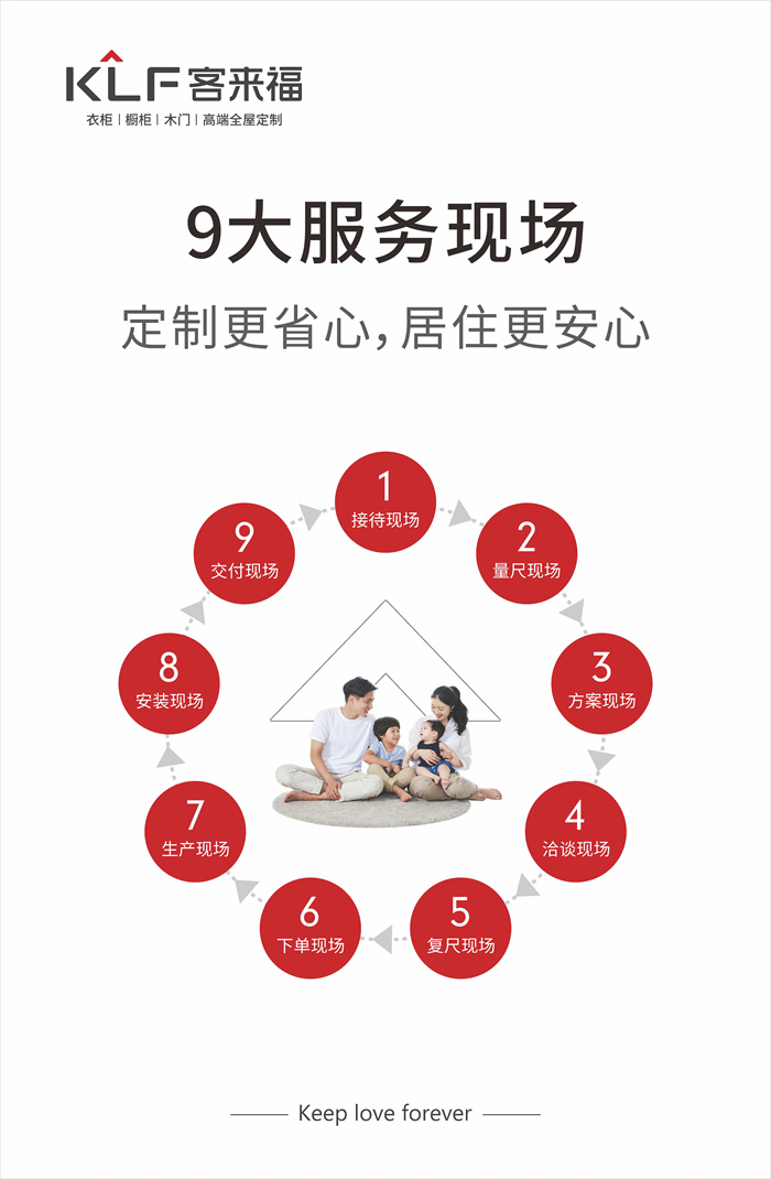 此外,客來福還以接待,量尺,方案,洽談,復(fù)尺,下單,生產(chǎn),安裝,交付九大服務(wù)現(xiàn)場(chǎng)保障廣大客戶的“幸?!鄙?。