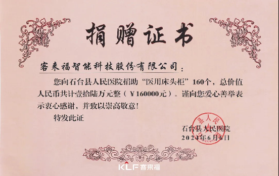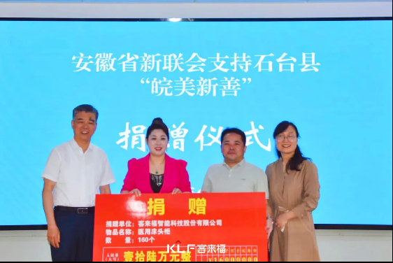 儀式上,客來福智能科技股份有限公司向石臺(tái)縣人民醫(yī)院捐贈(zèng)了價(jià)值16萬元的醫(yī)用床頭柜。